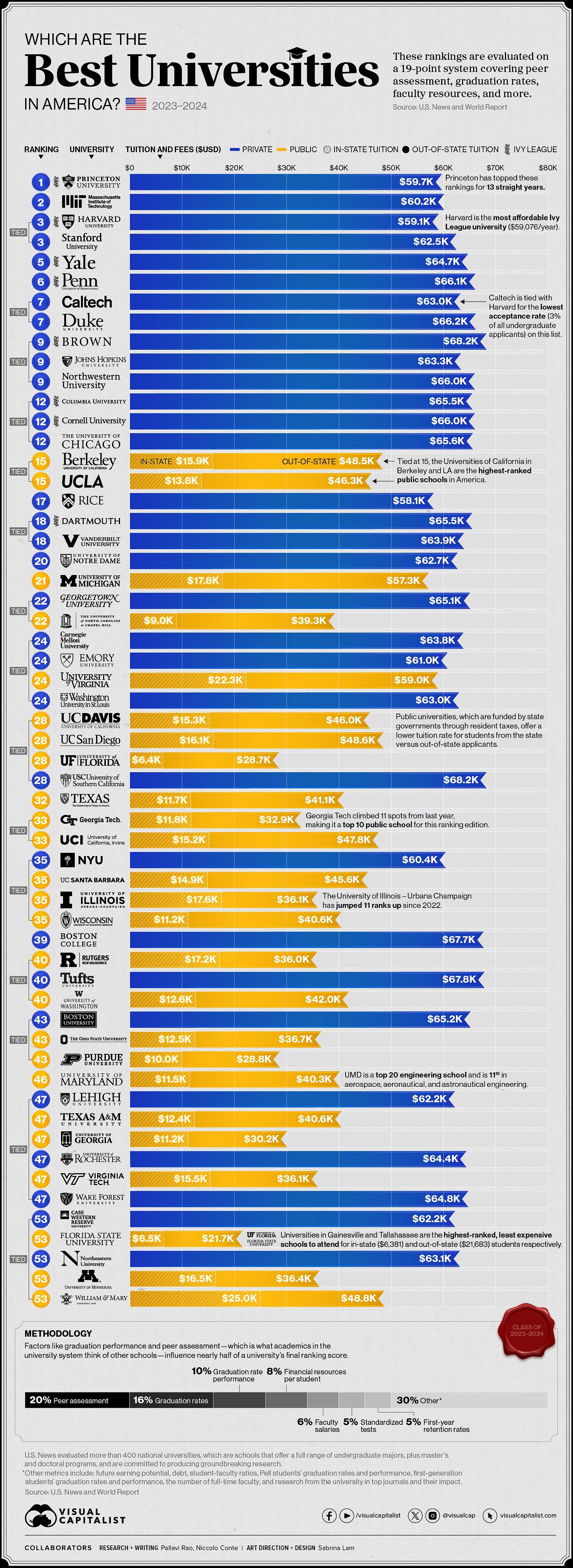 The latest ranking of America's best universities is in, just in time for the upcoming admissions season. US News and World Report used 19 metrics to assess over 400 national universities, including graduation rates, peer assessment, financial resources, debt, and Pell Grant graduation rates. Here are the results, beautifully displayed in the data visualisation produced by Visual Capitalist.