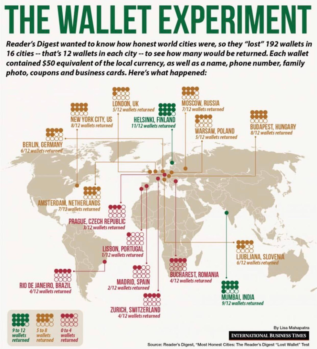That's what this first infographic is about. Reader's Digest conducted an experiment – they lost 192 wallets in 16 cities and measured the results. Interestingly, Zürich scored pretty badly. London, New York, and even Moscow, did far better. The most honourable cities were Helsinki (unsurprisingly) and Mumbai (a big surprise for me). This just shows that you shouldn't let your biased perceptions of cities get the better of you.