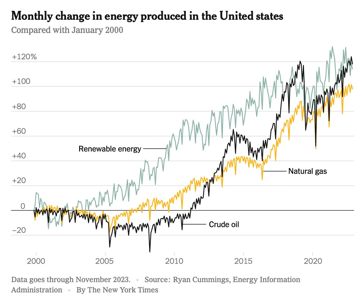 As you can see from this beautifully illustrated chart from the New York Times, everything in the US is booming: oil, gas, and renewable energy. The US is rapidly moving towards energy independence and might probably already be there now.