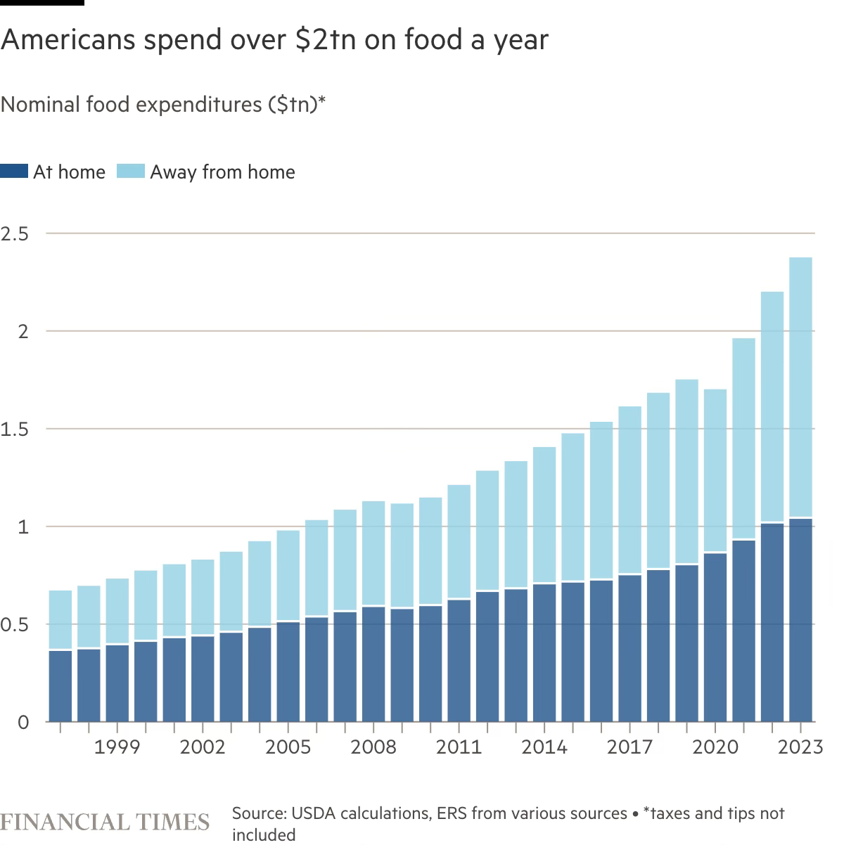 Restaurant and takeaway spend in the US has doubled in two decades and hit $1.2 trillion in 2023, eclipsing grocery bills even after a pandemic dip. This chart from the Financial Times shows food-away-from-home racing past supermarket outlays as total food spend tops $2 trillion.