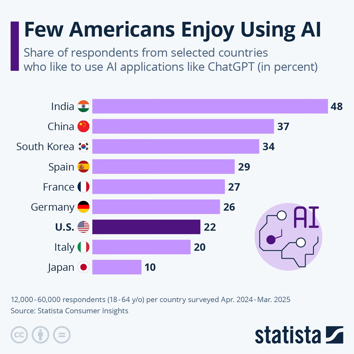 Steal-this-caption – “Just 22% of Americans like using ChatGPT-style apps –India has double that share.” #FiveChartsDaily