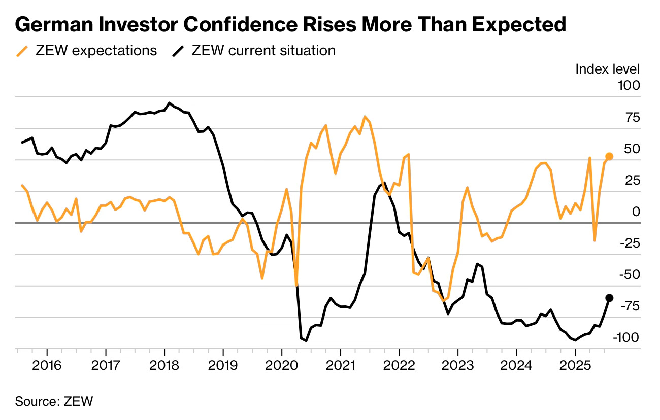 German investors are betting on a recovery that hasn't arrived yet. The ZEW expectations index surged to 52.7 in July from 47.5 in June, smashing analyst forecasts of 50.3 and marking the highest reading since early 2023. This dramatic swing in sentiment comes despite the current situation index remaining deeply negative at -59.5, though that's improved from -72 in June.