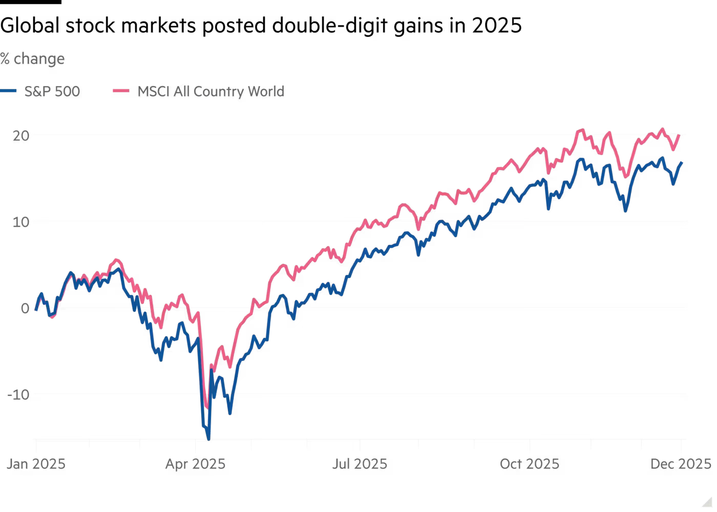 Both the S&P 500 and global equities move almost in lockstep through 2025. They fall together in early spring and recover steadily through the rest of the year. By the final quarter, global equities are modestly ahead. The outperformance is not dramatic, but it is persistent. This matters because the global index used here is already heavily tilted towards US stocks, with the US making up roughly 60% of the total.