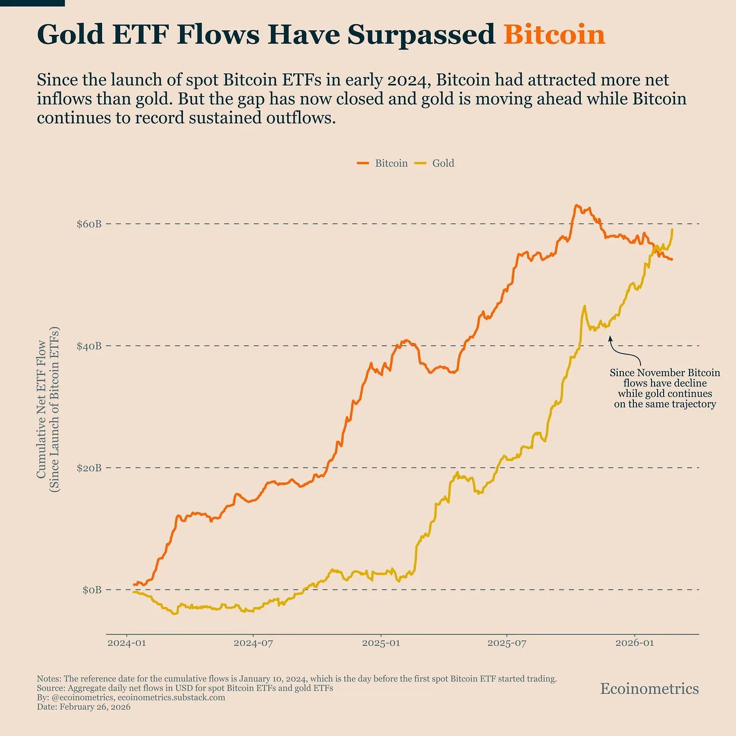 When spot Bitcoin exchange traded funds began trading in January 2024 they unleashed an extraordinary surge of capital. For much of the following year the flow of money into Bitcoin funds comfortably exceeded that of gold. Investors appeared eager to gain regulated exposure to a digital asset that had long existed on the fringes of traditional finance. The narrative was simple. Bitcoin had finally been admitted to the institutional portfolio.