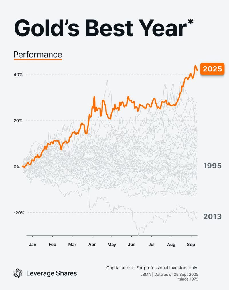 Two numbers capture the scale. Spot prices are up about 48 per cent this year after a 27 per cent gain in 2024, a remarkable two-year surge that has outpaced most major assets. On 6 October, gold hit $3,960 intraday before briefly breaking $4,000 a day later.