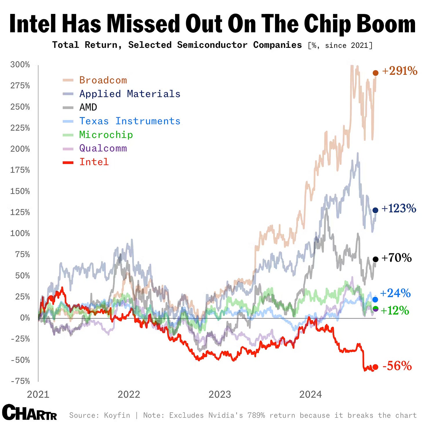 Once the crown jewel of American semiconductor manufacturing, Intel now finds itself adrift. Its competitors are riding the wave of AI leaving poor Intel behind as their valuations soar and Intel’s falls – Intel has lost over 56 percent of its share price value since 2021.