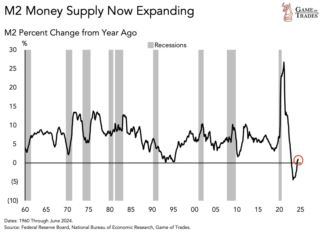 If you look at the red circle at the end of the chart, you'll see that M2 growth has recently turned positive again, but at a very moderate pace. This indicates that the Fed may have some room to cut interest rates in September without risking excessive inflation. However, this could change very quickly if money supply growth picks up once again.