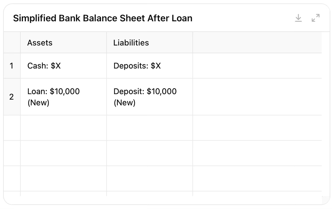 This is similar to how bonds or stocks are issued, where new financial instruments are created that represent assets and liabilities. So, while the money supply increases, this increase is tied to the creation of a corresponding liability, reflecting the loan you now owe the bank.
