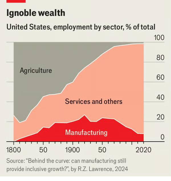 This chart illustrates that transformation – factory payrolls have collapsed while modern service trades have expanded. The data challenges political nostalgia for manufacturing's heyday and points capital toward investing in tomorrow's workforce rather than yesterday's jobs.