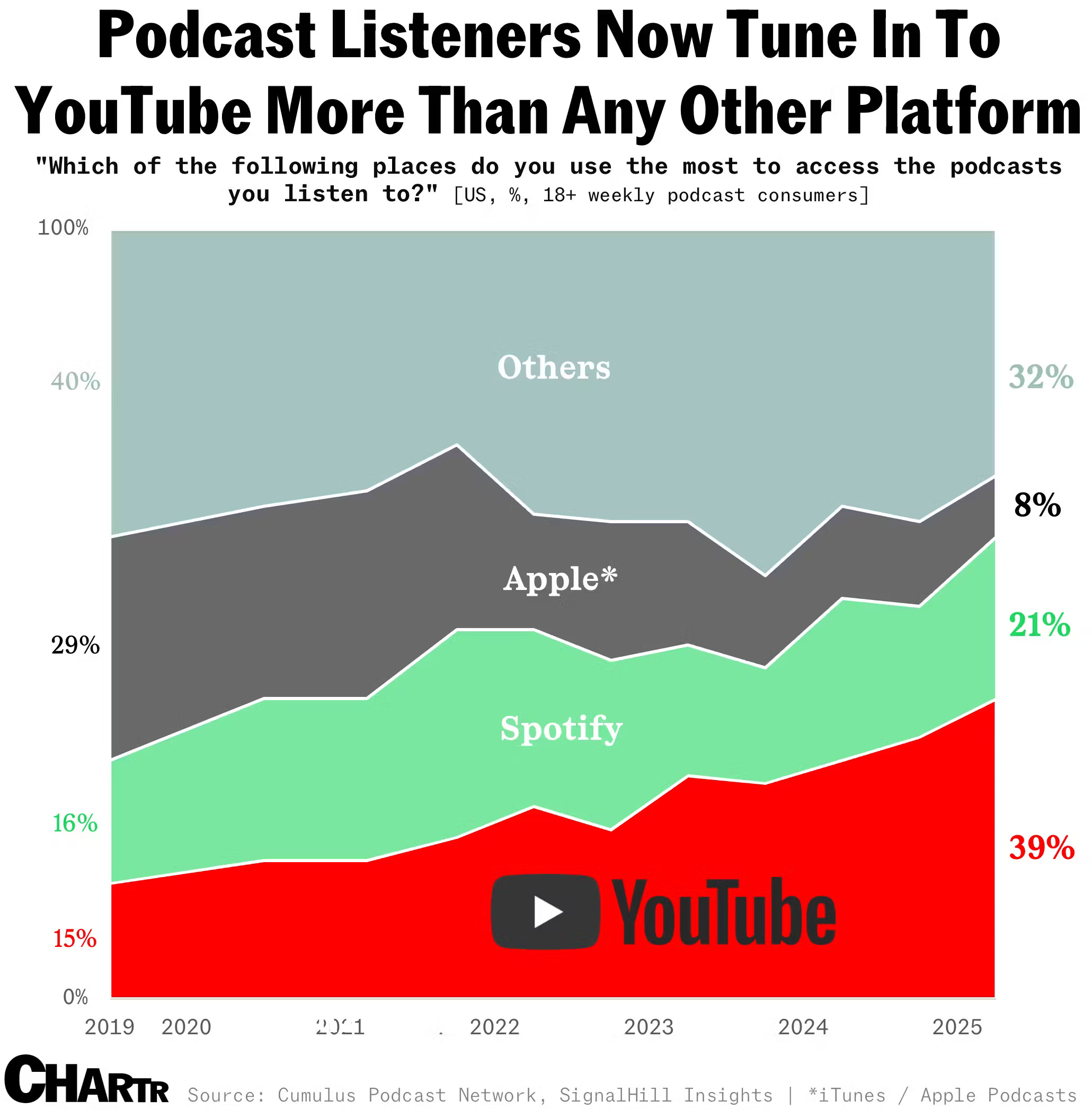 Let’s have a closer look at this chart from Chartr. Overall, 39% of weekly US podcast listeners now choosing YouTube as their primary platform. YouTube has been so successful that the video giant has left Spotify scrambling at 21% and Apple's once-dominant Podcasts app gasping at just 8%.