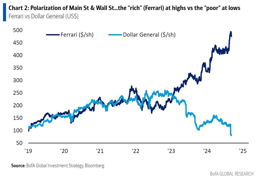 The global economy is experiencing a significant divide, with luxury brands like Ferrari thriving while budget retailers struggle. You can see this split below between the contrasting fortunes of Ferrari and Dollar General – a major American discount store chain known for selling low-priced household items to budget-conscious consumers