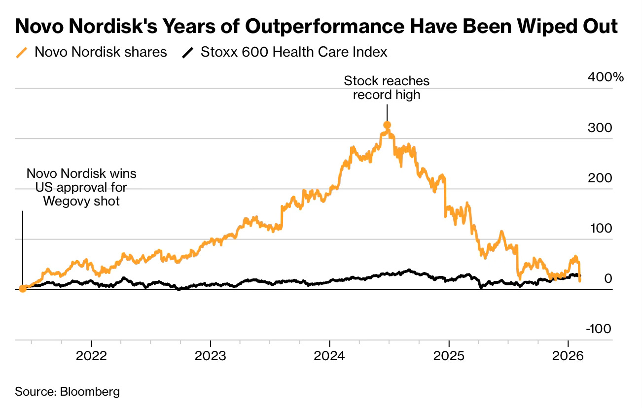 Few companies symbolised the post pandemic equity boom like Novo Nordisk. This chart shows that from 2021 to its 2024 peak, the shares rose more than 300%, dramatically outperforming the Stoxx 600 Health Care index. That entire period of outperformance has now been erased.