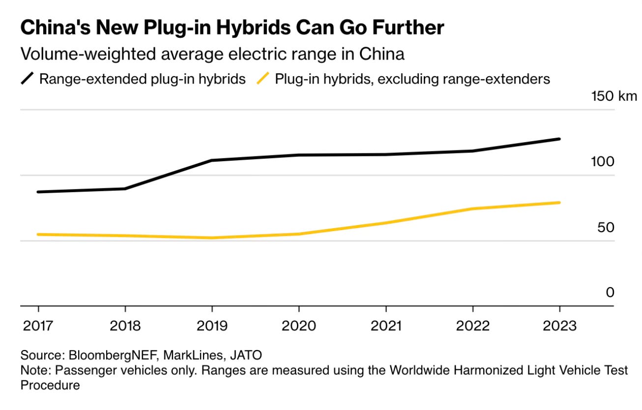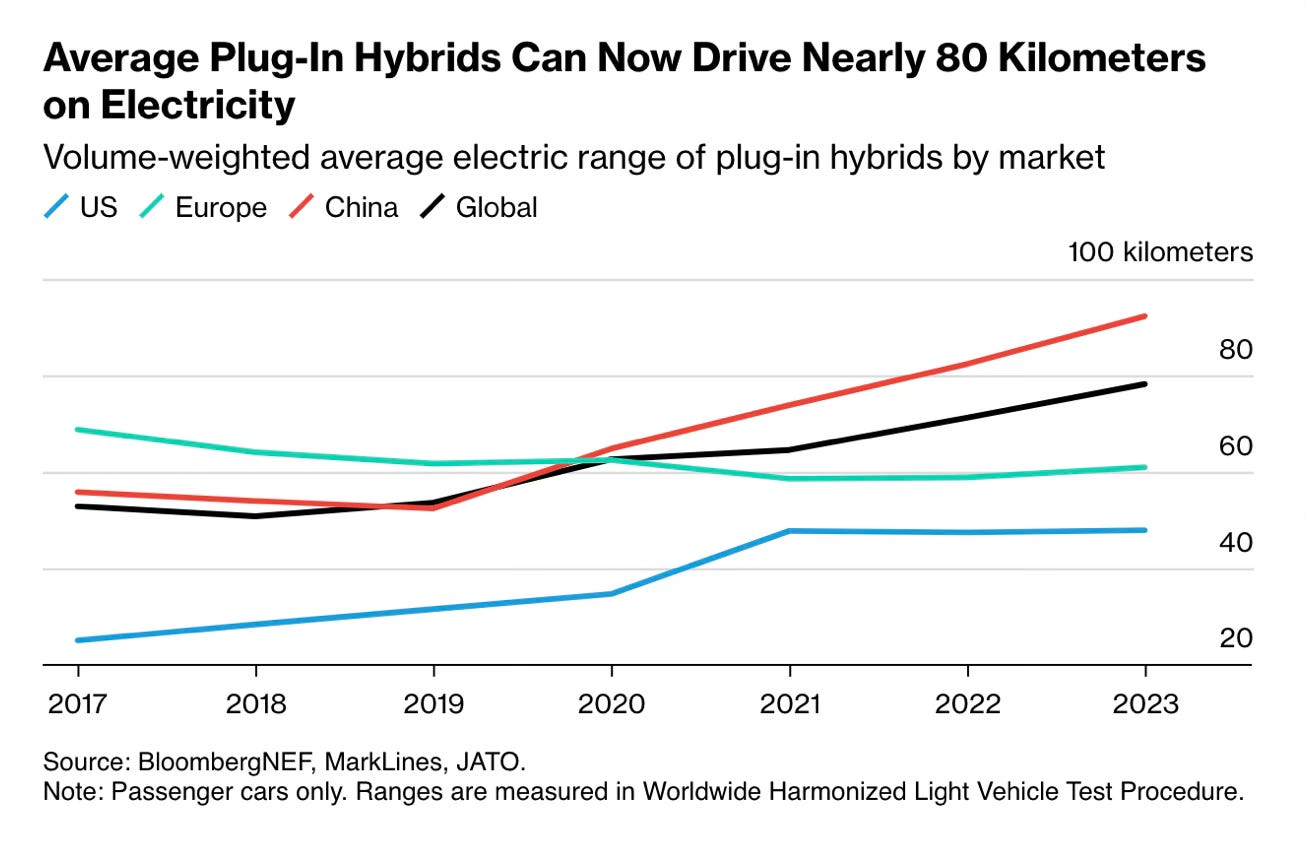 The average PHEV range has increased from 50 kilometers in 2019 to nearly 80 kilometers in 2023, with China driving much of this growth. Additionally, about a third of PHEV sales in China last year were extended-range electric vehicles, with an average range of 127 kilometres.