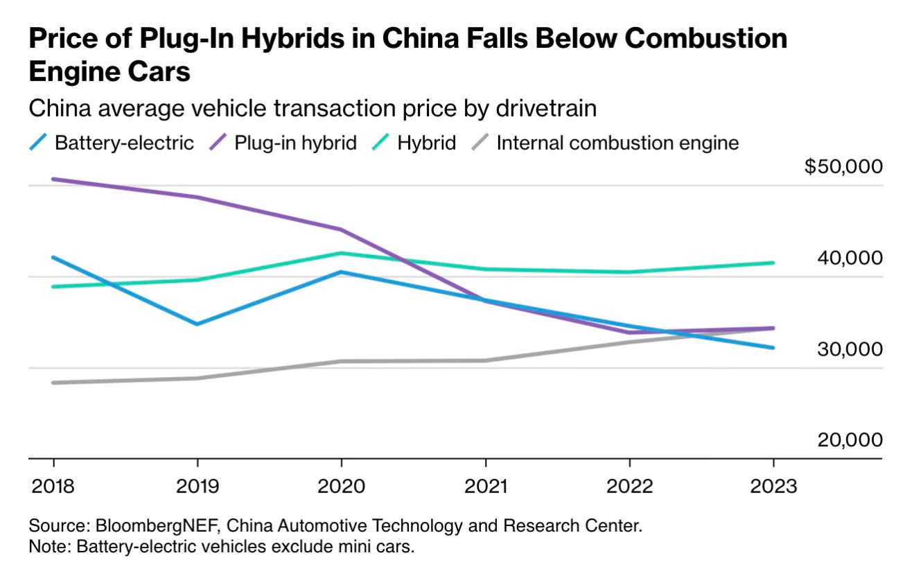 So what’s the future. Well, this is very much a transition technology. PHEVs market share will eventually fall as declining battery prices and better battery technology, will eventually see all-electric vehicle take over the market. In fact in China, thanks to generous government support, the cost of battery electric vehicles have already fallen below the cost of traditional combustion engine vehicles.