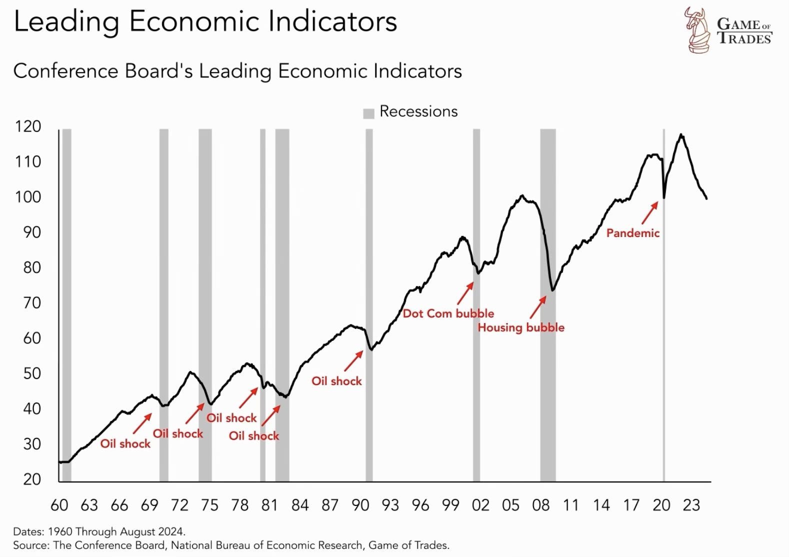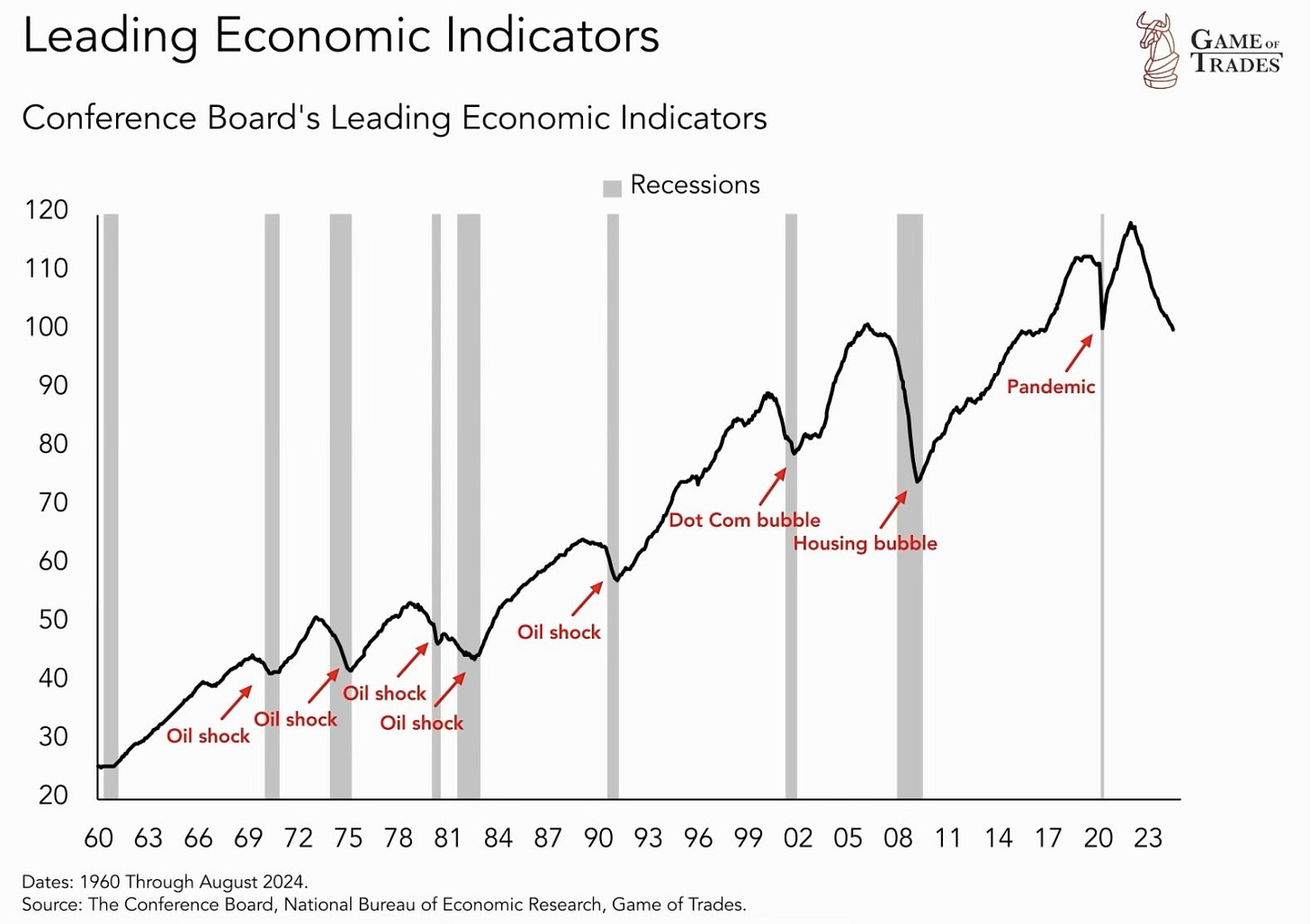 These examples show how unexpected events can quickly disrupt economic activity, leading to job losses, reduced spending and economic contraction. That's why economists look at leading indicators to spot signs of trouble. As you can see in the chart below from Game of Trades, they tend to be quite accurate.