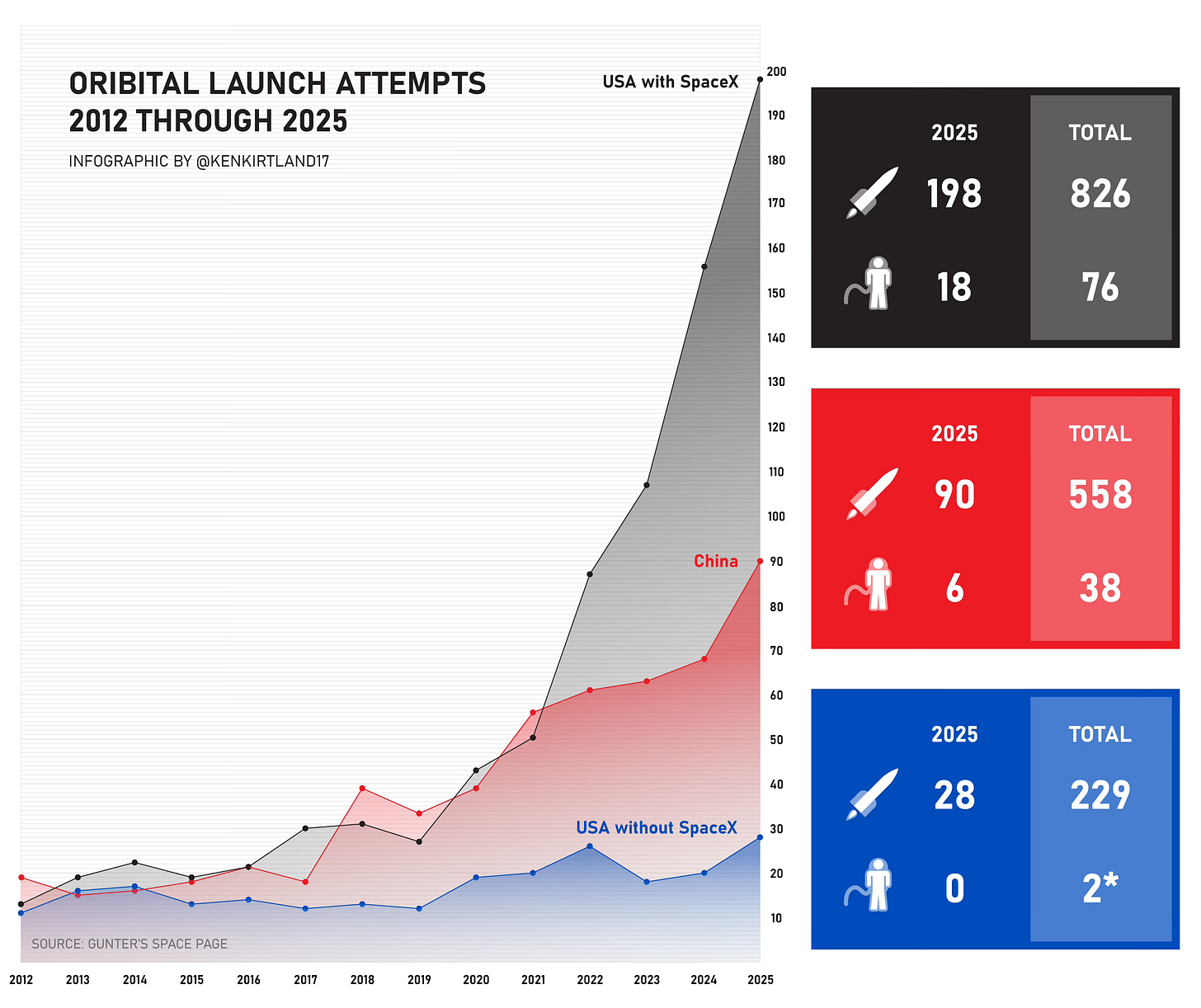 For $10 a month, or $100 a year, you support a simple mission: spread great data visualisation wherever it comes from. You help fund the work of finding, sourcing and explaining the charts that deserve a wider audience. And you back a publication built on generosity, transparency and the belief that better understanding makes a better world.CHART 1 • SpaceX has given the US a decisive orbital edge
