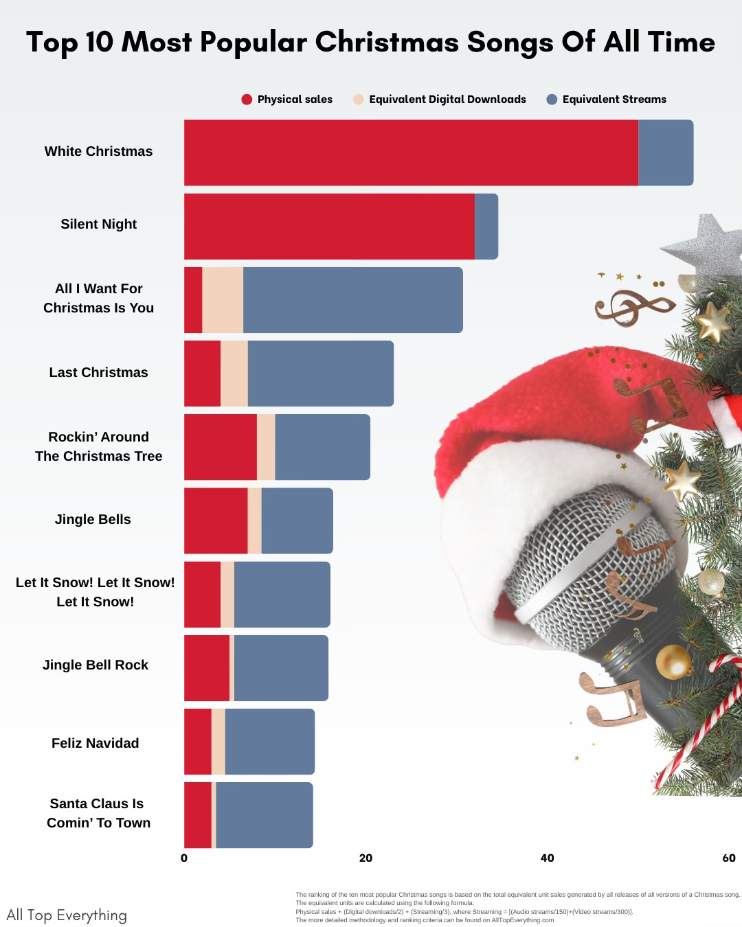 White Christmas still sits at the top, carried by decades of physical sales and cultural memory. Silent Night follows the same pattern. But after that, the hierarchy flips. All I Want for Christmas Is You dominates once streams are counted. Its physical sales are modest by historical standards, yet its annual streaming surge turns it into a recurring hit every single December.