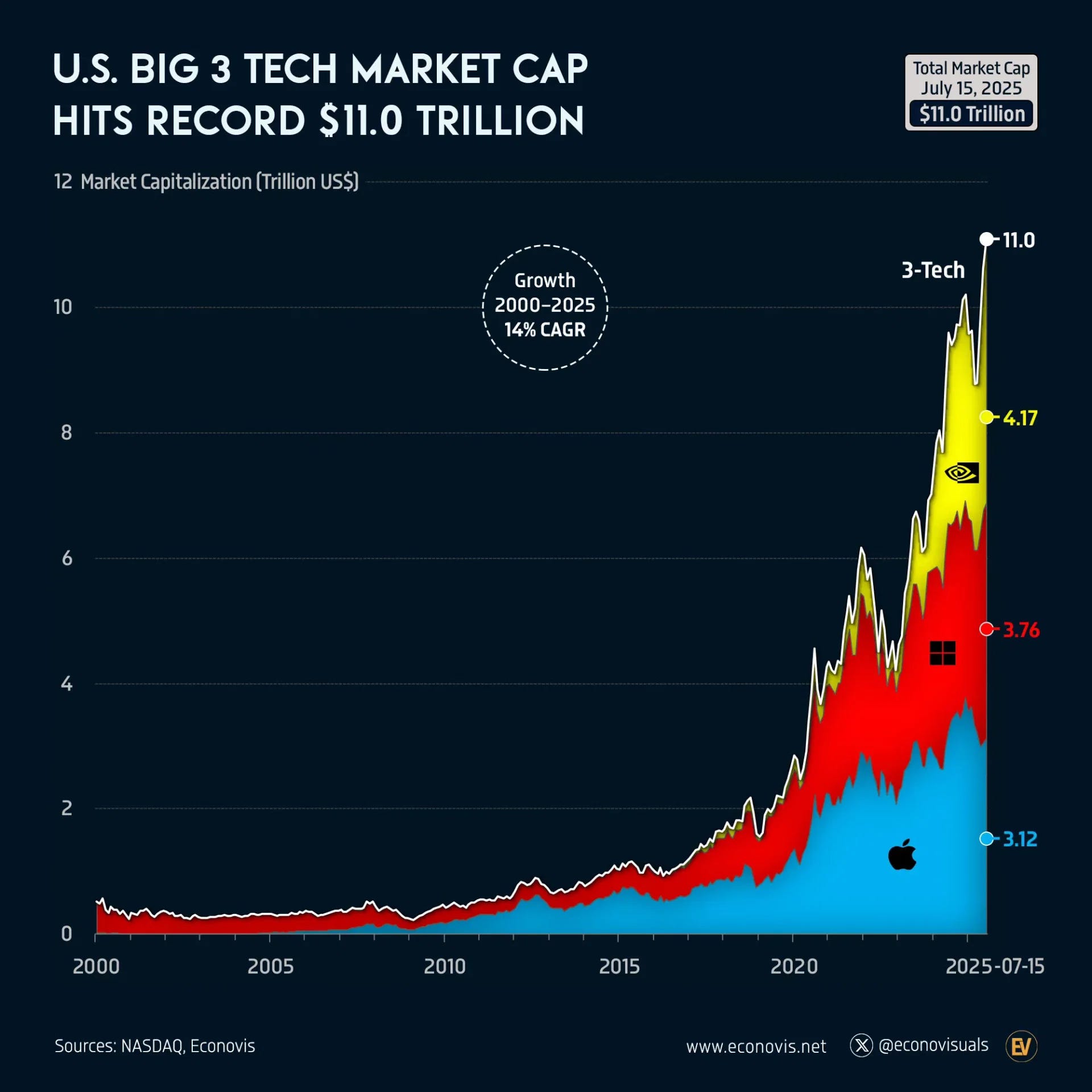 Nvidia has notched a market capitalisation of $4 trillion, making it the first public company in the world to reach the milestone, while Microsoft and Apple round out tech's triumphant trio. The combined value of these three companies has soared past $11 trillion. That's more than double Germany's entire $4.5 trillion economy, the world's third-largest.