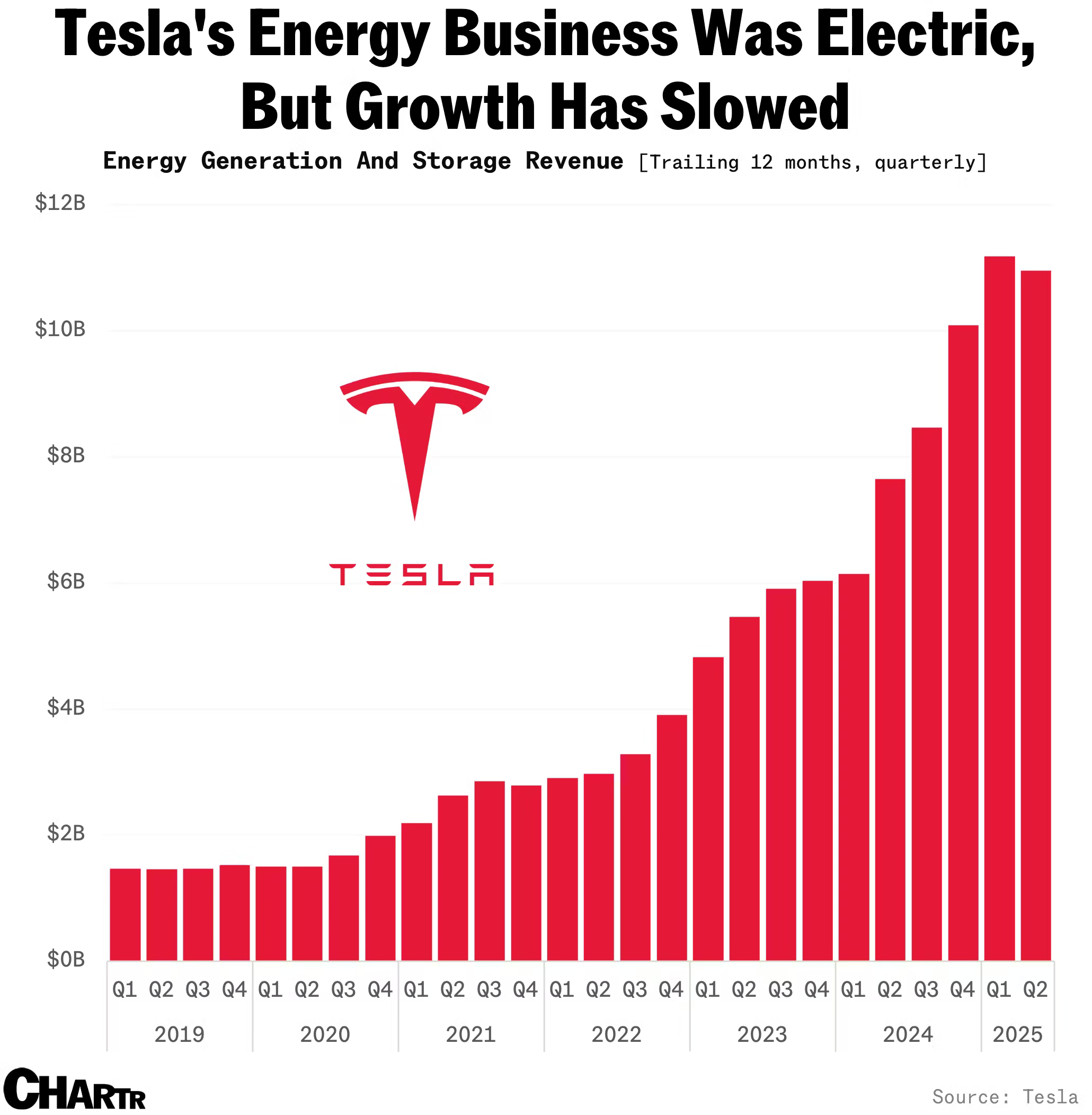 Tesla's energy business has quietly become its brightest spot, rocketing from $1.5 billion quarterly revenue to over $11 billion in just six years. The company deployed a record 11 GWh of energy storage in Q4 2024, while Q2 2025 installations reached 9.6 GWh, down slightly from Q1. Revenue from energy storage and solar installations grew from $2 billion in 2020 to $10.1 billion in 2024. The growth trajectory is remarkable.