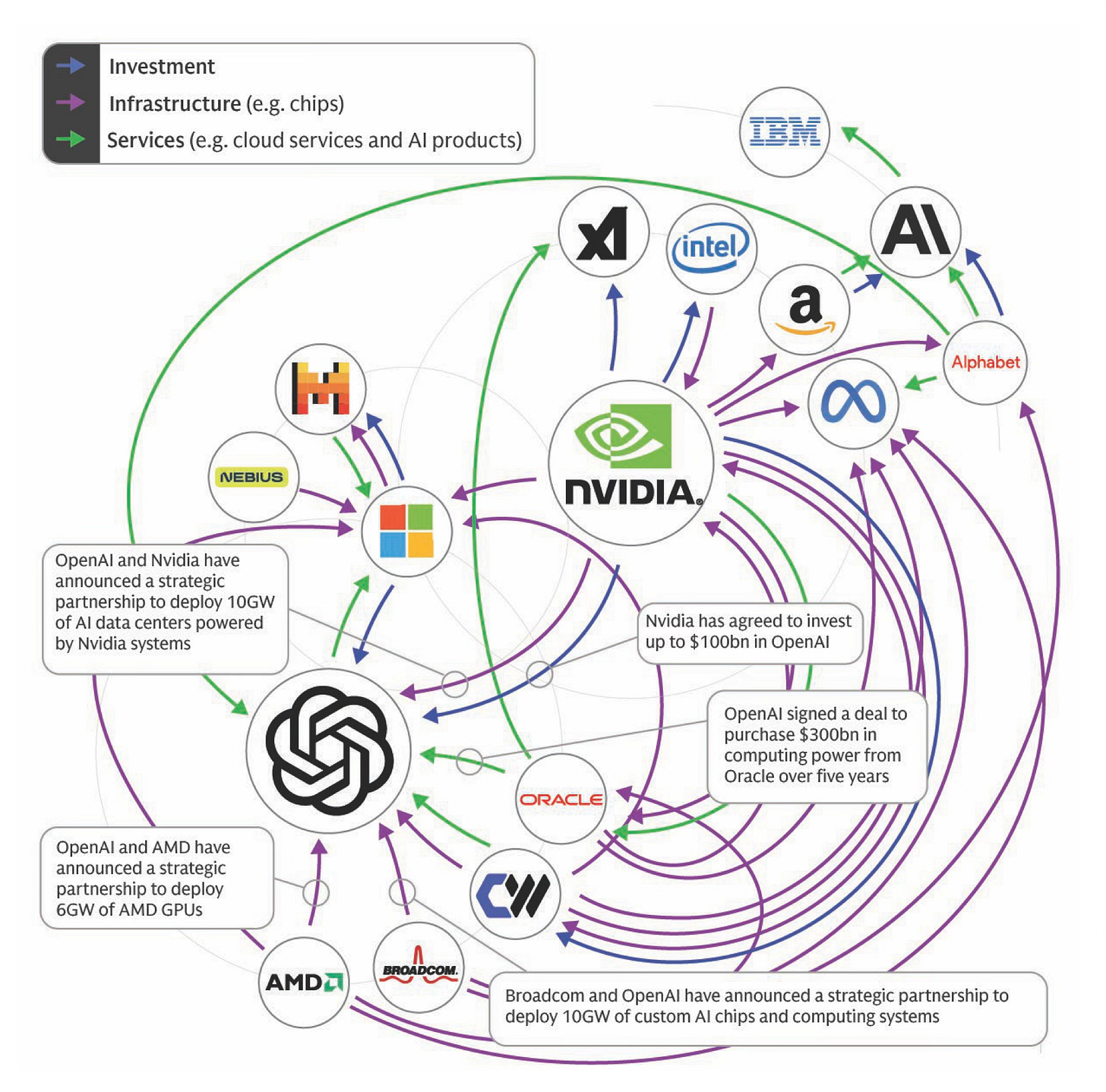 At the centre sits OpenAI surrounded by Nvidia Microsoft and Oracle each linked through enormous commitments. Nvidia has agreed to invest up to $100bn in OpenAI. OpenAI has signed a deal to purchase $300bn in compute from Oracle. Nvidia and OpenAI plan to deploy 10GW of data centres together. AMD and Broadcom have similar multi gigawatt partnerships. These are not normal commercial contracts. They are ecosystem defining alliances that bind infrastructure investment product development and strategic control into one tight cluster.
