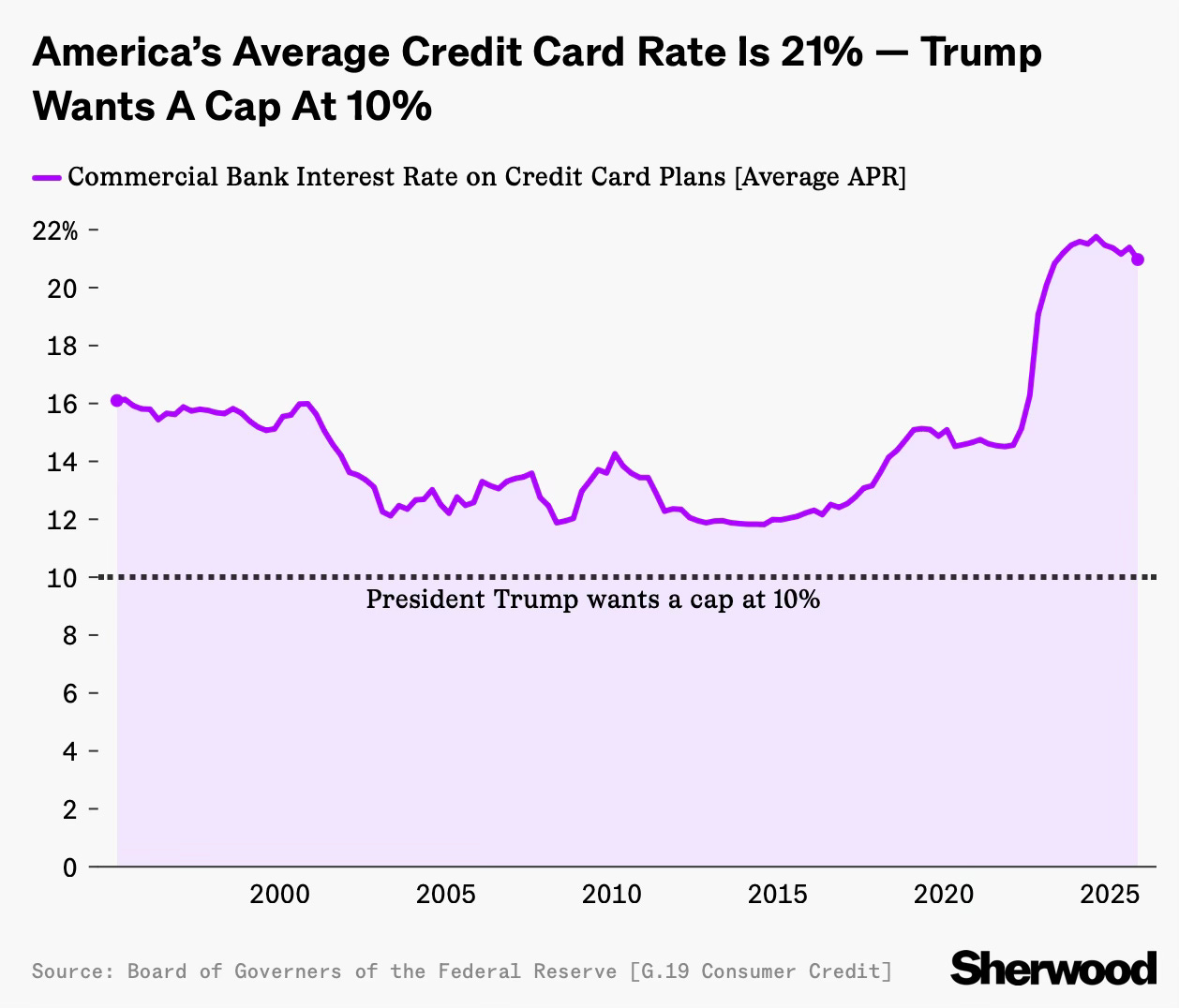 The average credit card rate is about 21%. For much of the 2000s and 2010s, it was in the low to mid teens. When the Federal Reserve raised interest rates, credit card rates rose quickly. When other borrowing costs later fell, credit card rates stayed high. A cap at 10% would mean cutting today’s rates by roughly half.