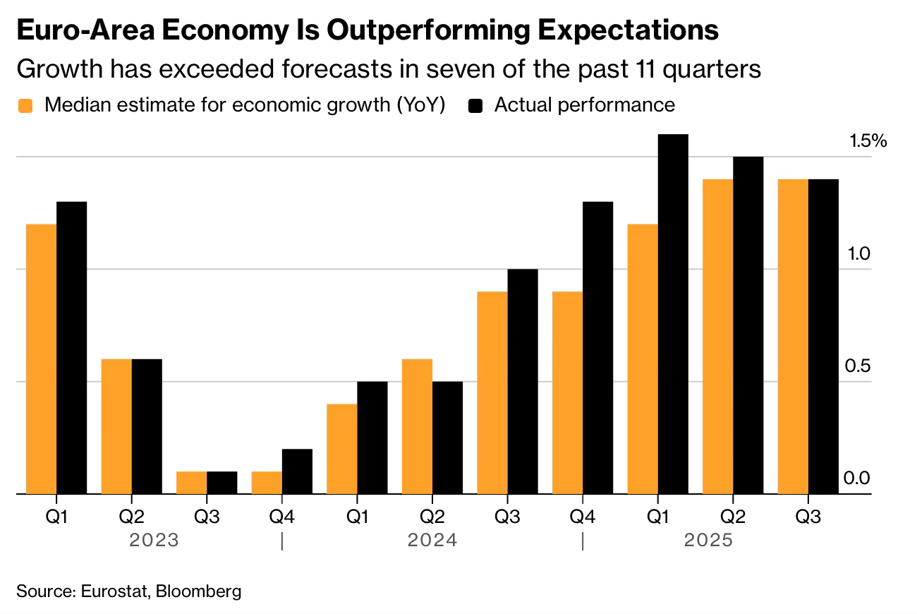 This chart shows something Europe is not used to. For seven of the past eleven quarters actual growth has come in stronger than economists predicted. The bars tell the story clearly. The orange estimates sit lower than the black outcomes again and again from early 2023 through to 2025.
