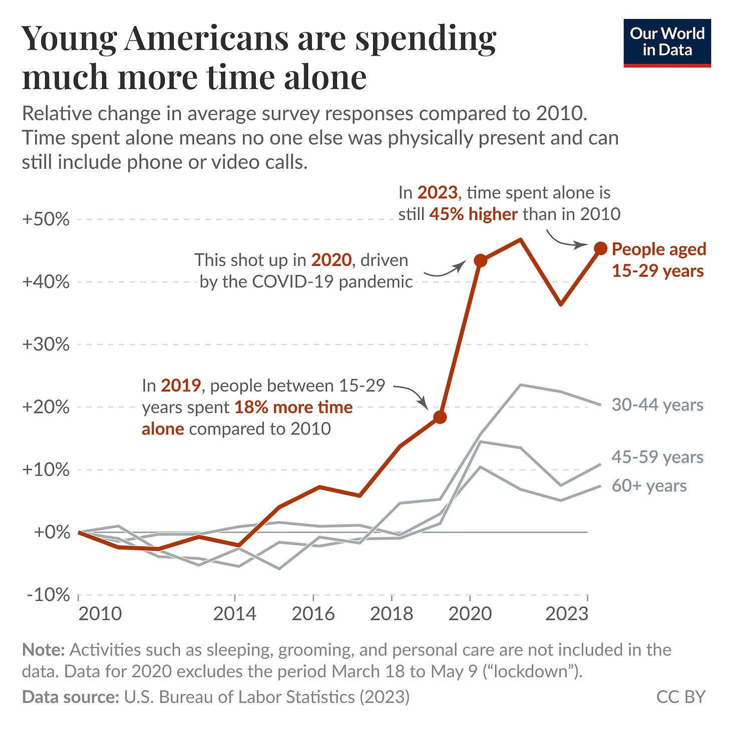 The data narrates a devastating story. Even before Covid touched our lives, young Americans had drifted into solitude, spending 18% more time alone by 2019, a gradual withdrawal from physical company. Then 2020 arrived like an accelerant, pushing that figure to nearly 50%.