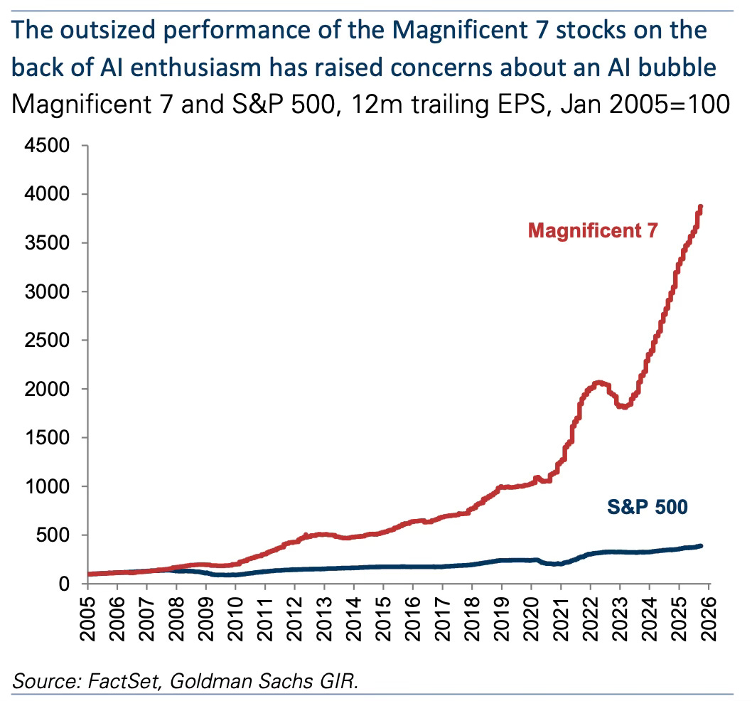 The Magnificent 7 have been on a different trajectory for years but this chart shows just how far they have pulled away from the rest of the market. Their earnings have risen more than 4,000 percent since 2005 while the S&P 500 has climbed only modestly. The gap was wide before the AI boom. It has exploded since.