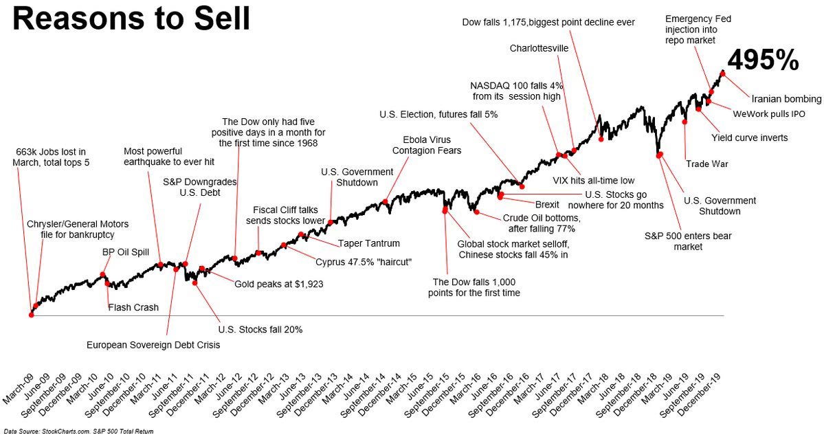 The chart is crowded with red dots. Each marks a moment that felt decisive at the time. Bankruptcies. Downgrades. Sovereign crises. Government shutdowns. Flash crashes. Trade wars. Ebola. Brexit. Oil collapses. Record point declines.
