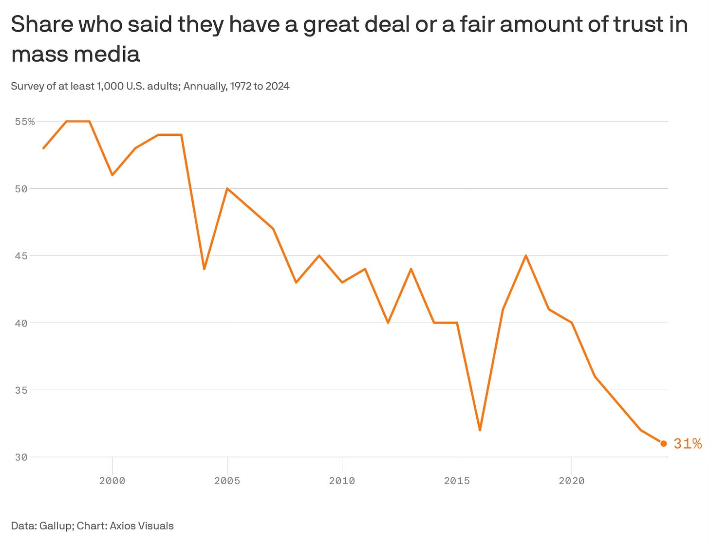 Trust in American media has hit rock bottom, reaching historic lows in a story that reveals deep fractures in our information landscape. Only 31 percent of Americans now say they trust the mass media –a stunning drop from an era when more than half the country had faith in their news sources.