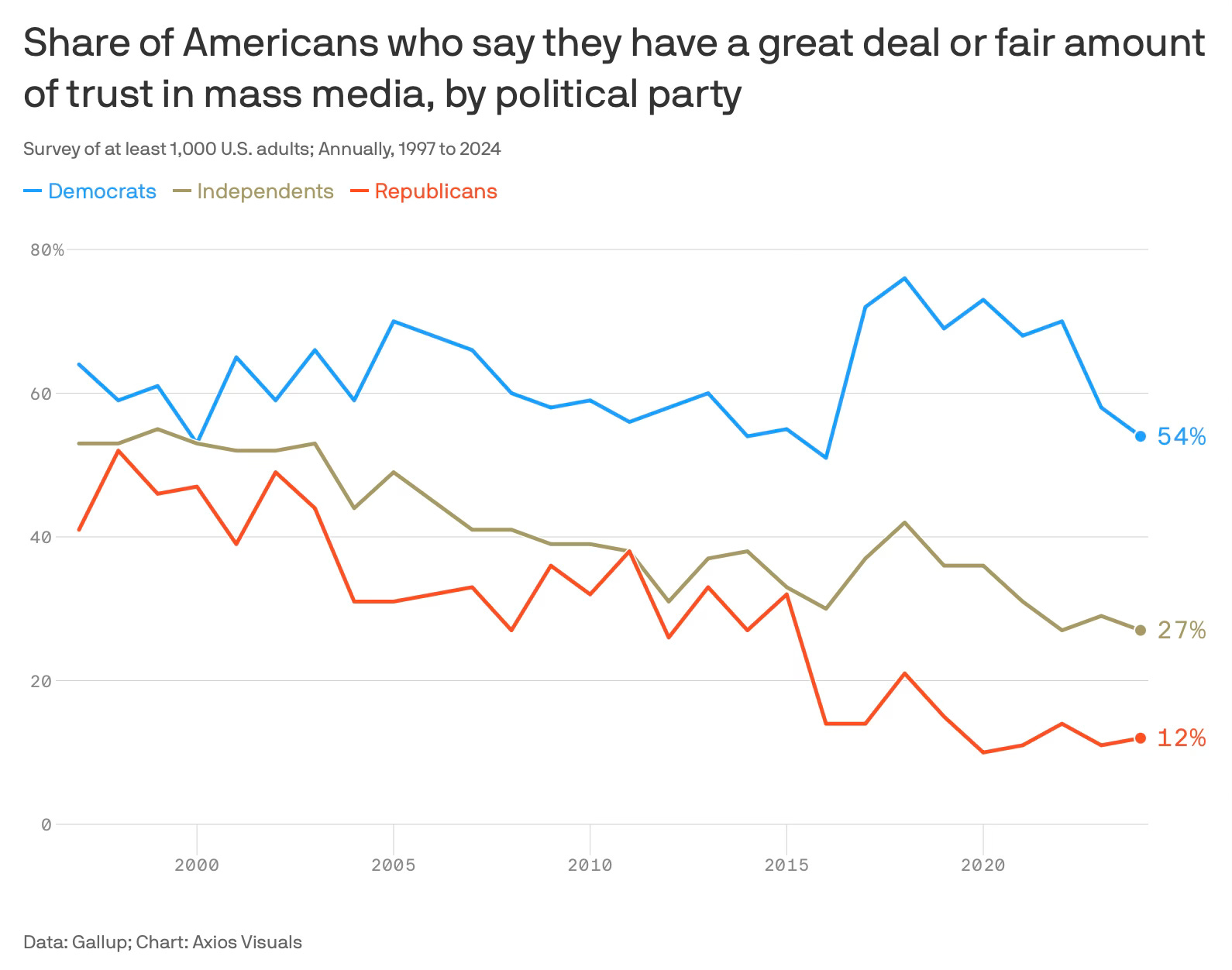 This isn't just about the media – it's a symptom of a broader erosion of trust in American institutions. Only local and state governments now command the trust of more than half of Americans, painting a troubling picture for the future of our democratic discourse.