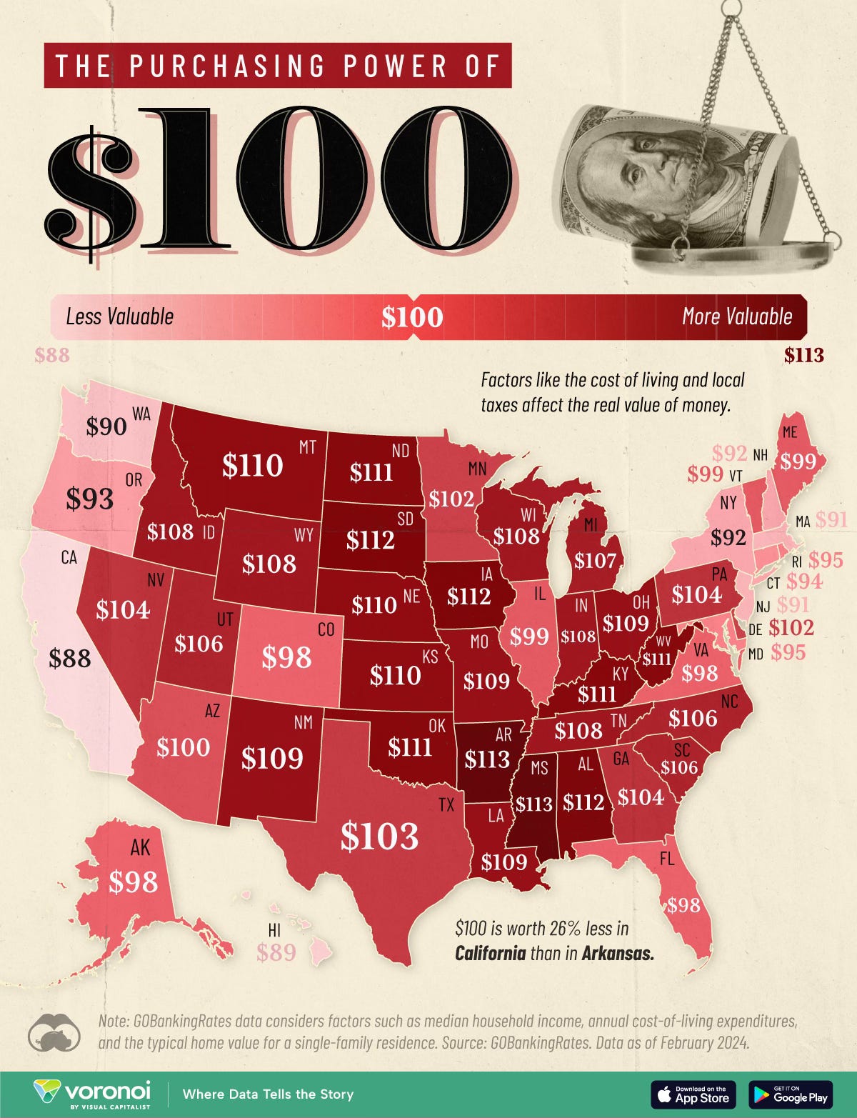 Take California and Arkansas, for example. In California, $100 is really only worth about $88. But head over to Arkansas, and it feels like you've got $113. That's a big difference!