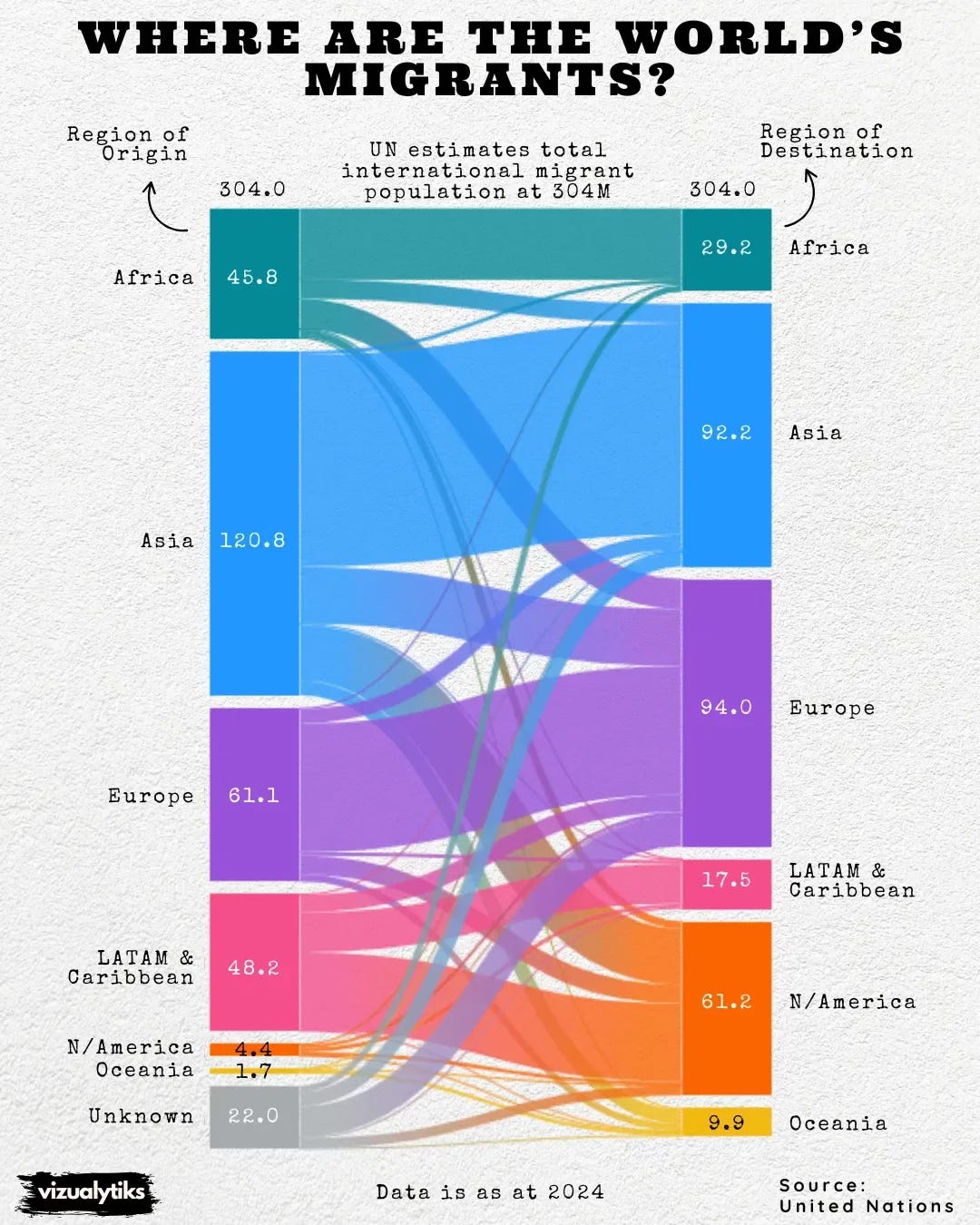 Europe hosts around 94 million, just ahead of Asia with 92 million. North America has 61 million, including more than 52 million in the United States alone. Most people still move within their region, but Europe and North America remain the biggest magnets.