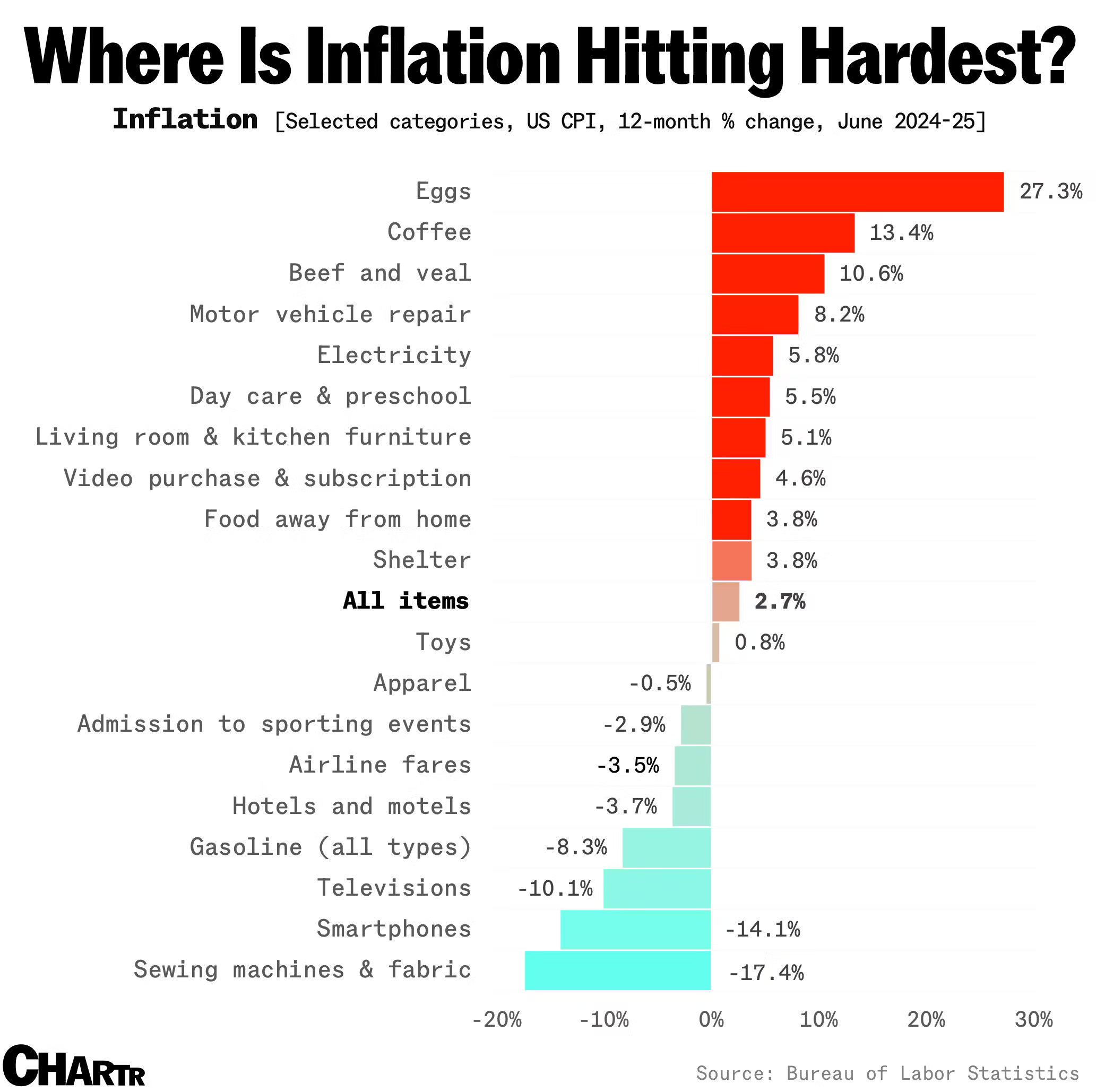 Eggs have cracked the inflation code, surging 27.3% year-on-year to lead all consumer categories. The US Department of Agriculture expects egg prices to increase 41 percent in 2025. Avian flu has devastated flocks, with 153.87 million birds affected since February 2022, including 127 million egg layers. Coffee follows at 13.4%, while tech products deflate dramatically.