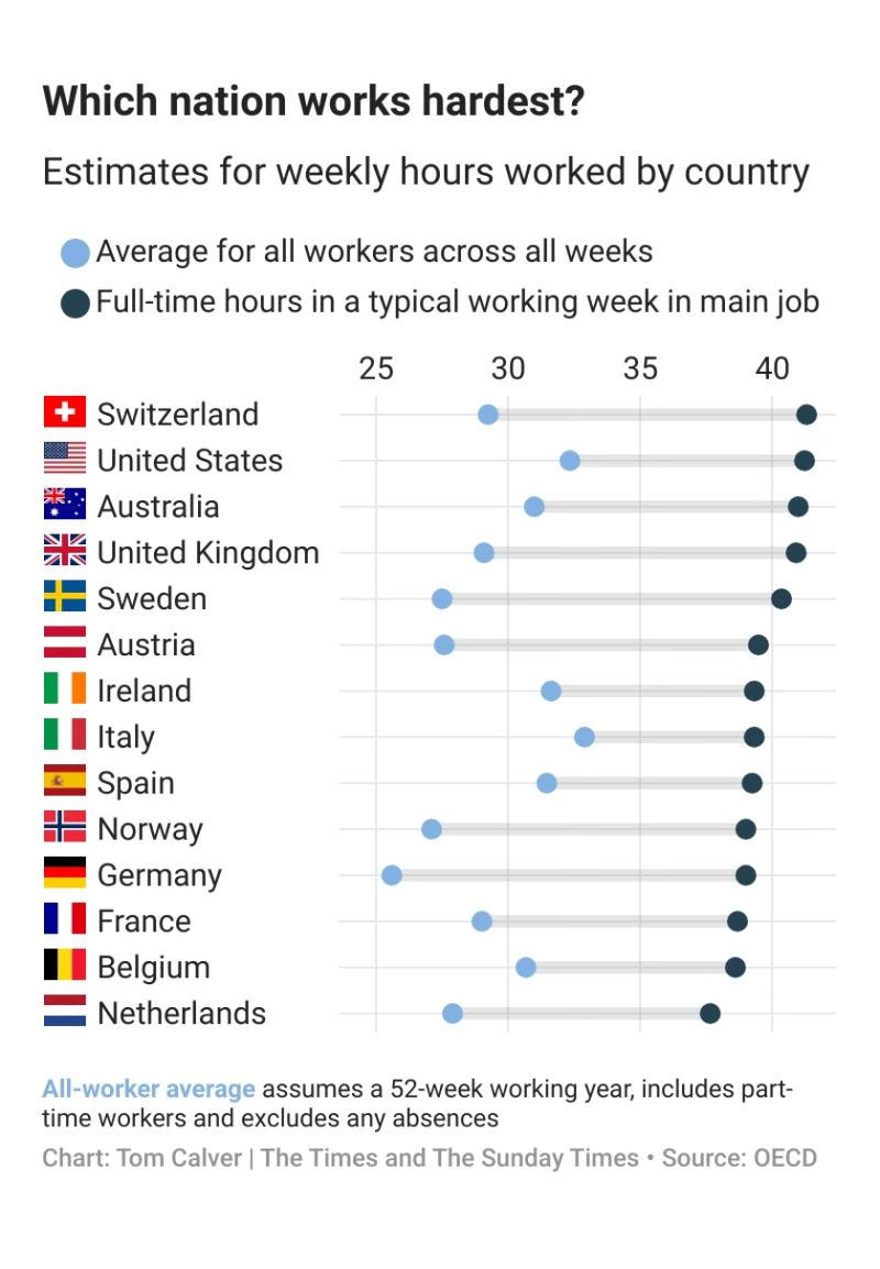The Dutch work just 28 hours a week on average – that's two hours less than Americans clocking in at 32 hours. Yet their GDP per hour worked remains among the world's highest at $74.80, proving you don't need to grind yourself to dust to be productive. Switzerland's full-time workers put in 41 hours per week, while maintaining the world's highest wealth per capita. Meanwhile, Germany works just 25.5 hours on average when including part-timers, yet remains Europe's industrial powerhouse.