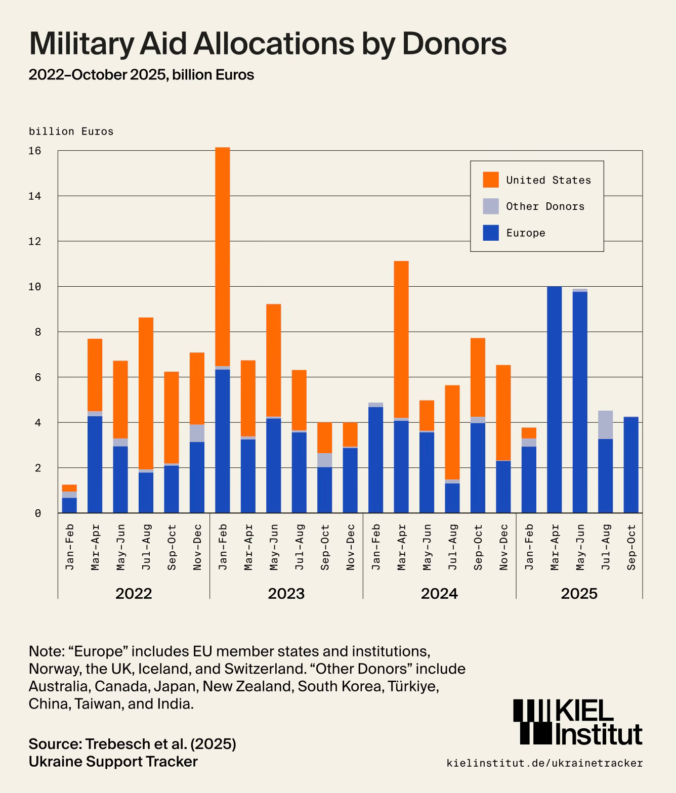 The United States remains the single largest donor, with large spikes tied to congressional approval cycles. Europe collectively matches or exceeds US support in many periods, though contributions are spread across countries and institutions. Other donors add smaller but persistent amounts.