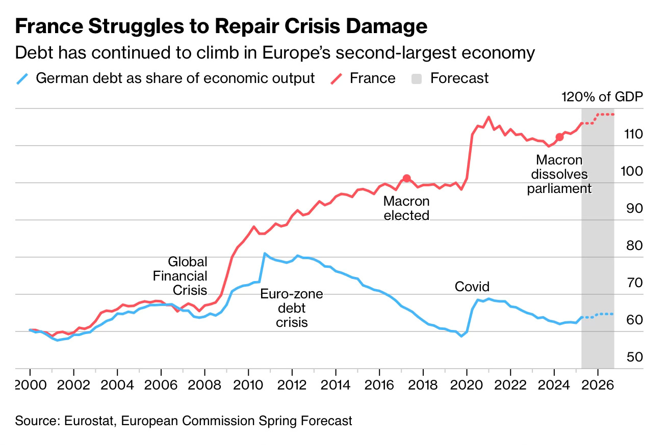 Look at the chart below. The fiscal nightmare keeps deepening. With debt approaching 120% of GDP and three government collapses in nine months, Europe's second largest economy is spiralling towards a reckoning that could shake the entire eurozone. The numbers are brutal: €3,346 billion in total debt, or €185 billion more than just a year ago. France now owes more relative to its economy than at any point since World War II, while Germany has methodically cut its debt burden to just 62% of GDP.