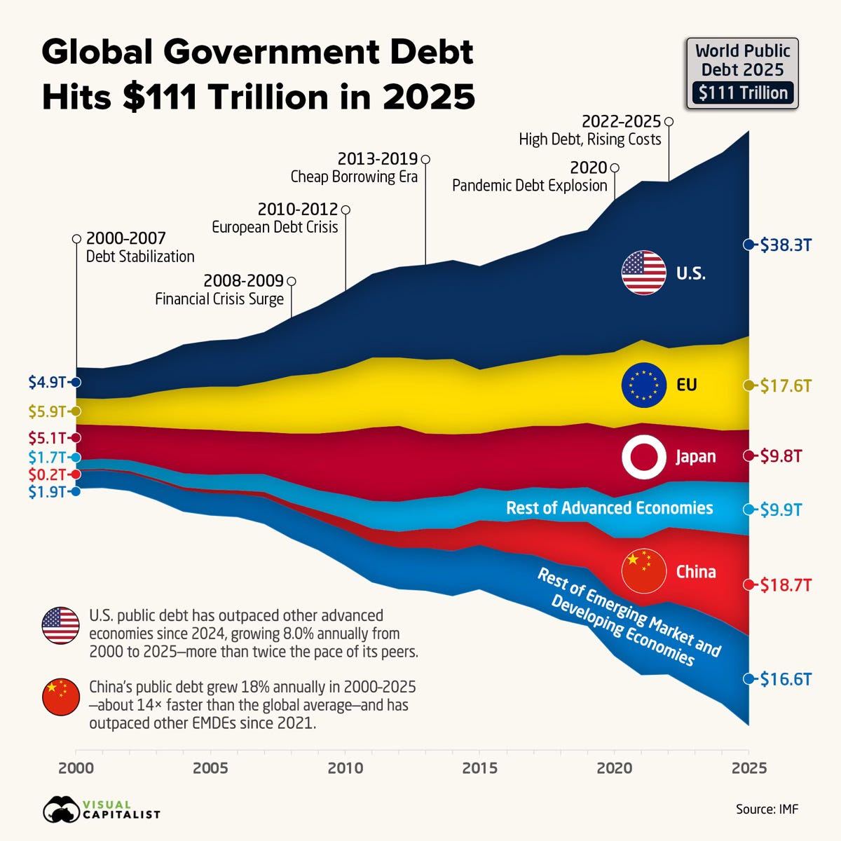 The chart shows that this is no longer crisis driven borrowing. It is structural. The US and China now dominate the picture, accounting for a large share of the increase. In the US, persistent deficits reflect spending choices that have not adjusted to higher interest rates. In China, debt has risen alongside efforts to sustain growth through investment.