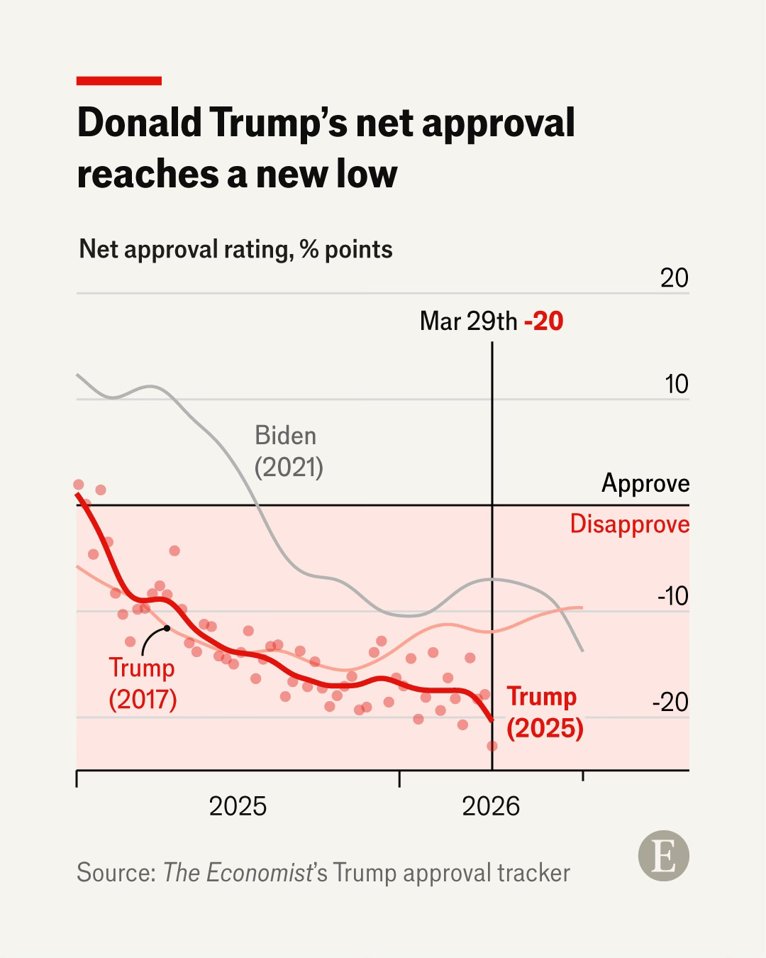 Donald Trump’s net approval has fallen to -20, its lowest point yet in his second term. That is not just another bad poll. It suggests his presidency is losing support faster, and from a weaker starting point, than it did the first time around. The Economist’s tracker shows his rating now sits below where it was at the comparable stage of his first term.